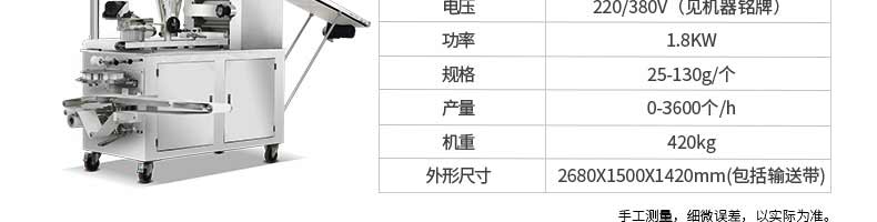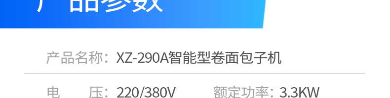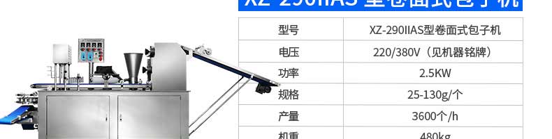 名稱XZ-290A智能卷式包子機(jī) 電源220/380v 功率3.3kw 產(chǎn)量0-36000個/h 尺寸2680*1500*1420mm 重量420kg 規(guī)格 其他