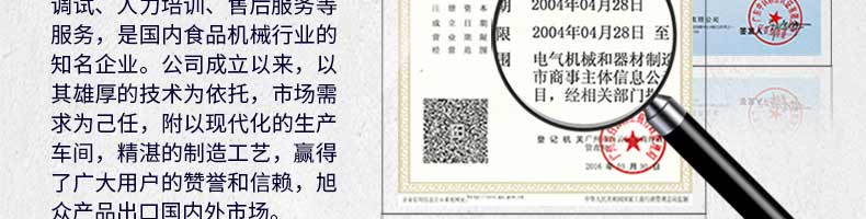 廣州旭眾食品機(jī)械有限公司是一家集科研開發(fā),生產(chǎn)設(shè)計(jì),營銷服務(wù)為一體的現(xiàn)代化生產(chǎn)企業(yè)?,F(xiàn)代化生產(chǎn)車間,精湛制造技術(shù),所產(chǎn)機(jī)械歷經(jīng)市場重重考驗(yàn),不斷贏得海內(nèi)外客戶的贊譽(yù)。