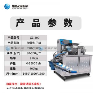 名稱XZ-390智能包子機(jī) 電源220V/380V 功率2.8KW 產(chǎn)量0-3600個(gè)/h 尺寸1480-1020*1300 重量400kg 規(guī)格20-200g/個(gè) 其他