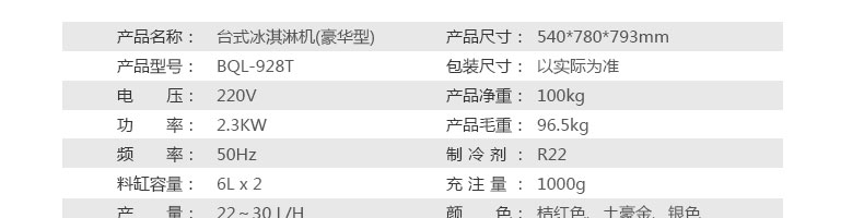 名稱BQL-928T臺(tái)式冰淇淋機(jī) 電源220V 功率2.3kw 產(chǎn)量22-30L/H 尺寸540*780*793mm 重量96.5kg 規(guī)格 其他