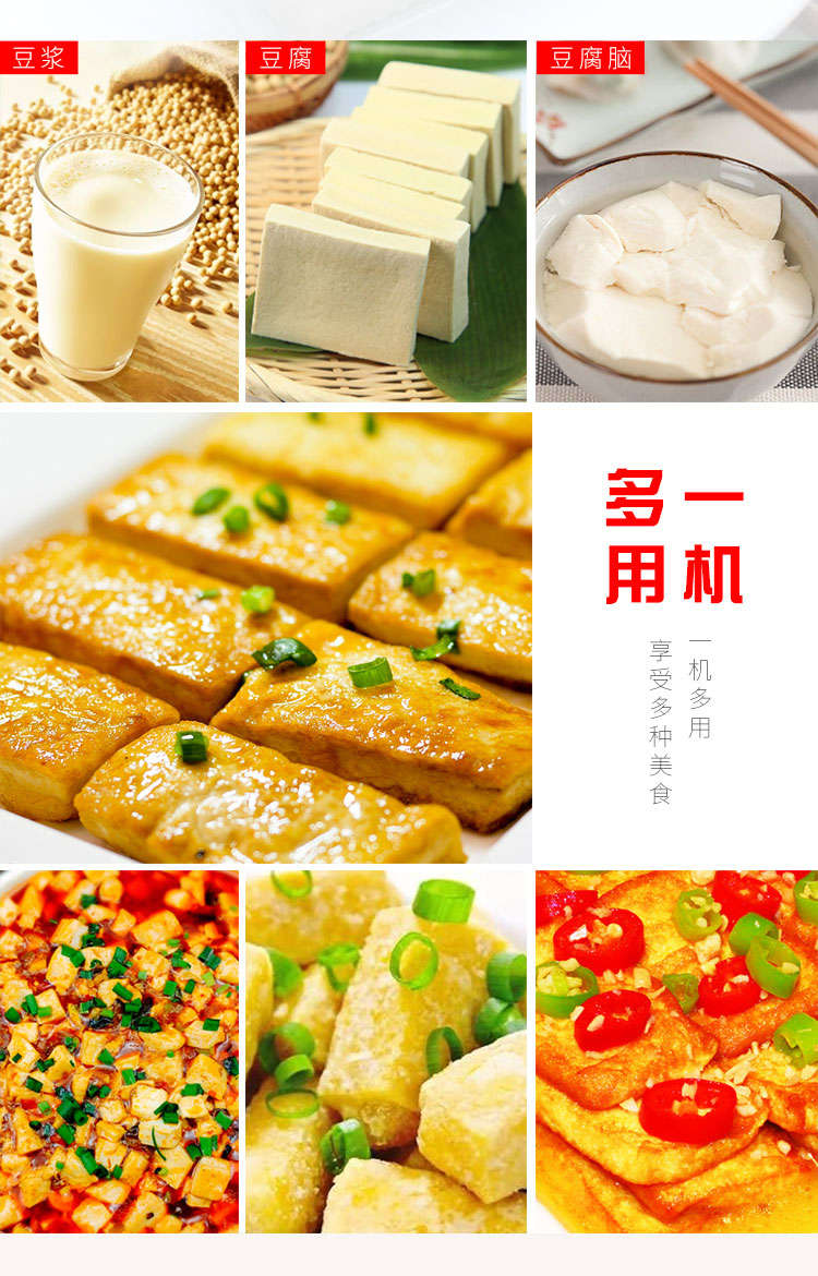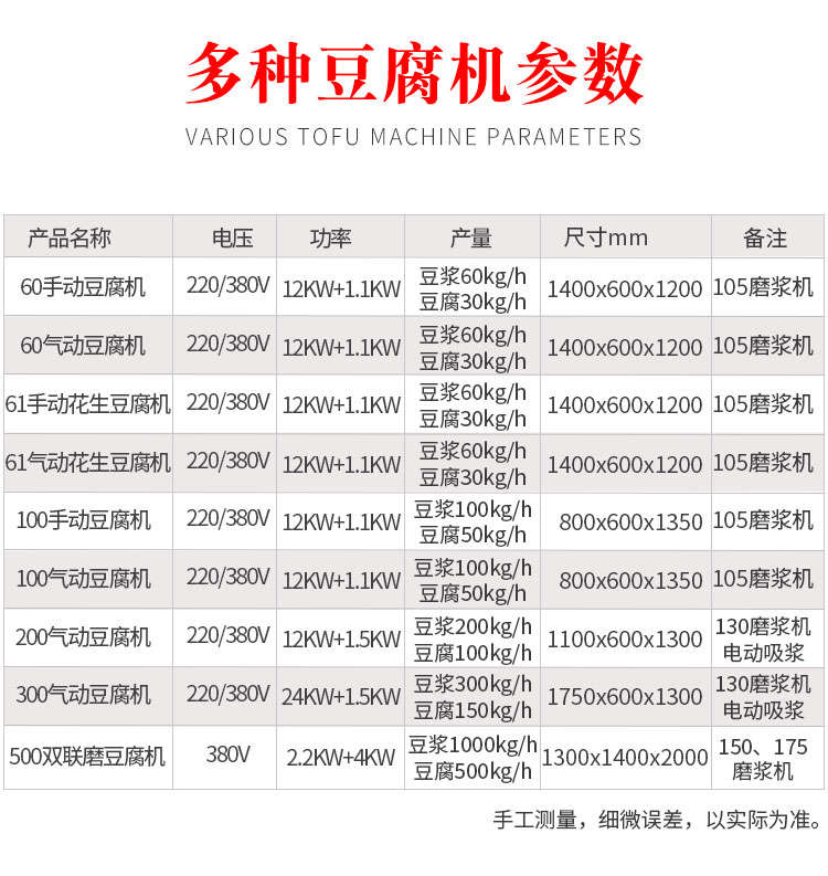 名稱XZ-100型全自動豆腐機(jī) 電源220/380V 功率磨漿11KW,煮漿12KW 產(chǎn)量豆?jié){產(chǎn)量100kg/h,豆腐產(chǎn)量50kg/h 尺寸800X600X1350mm 重量150kg 規(guī)格聯(lián)系銷售員 其他