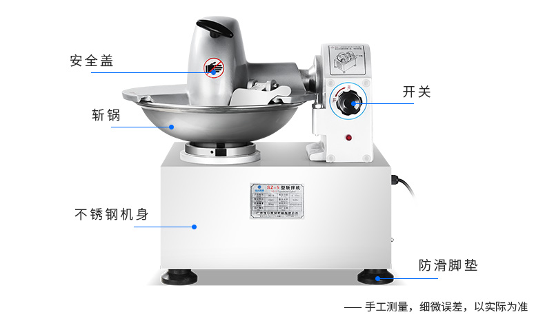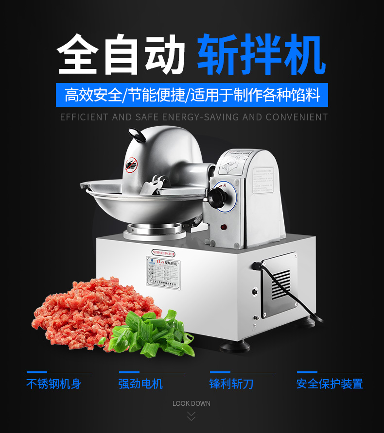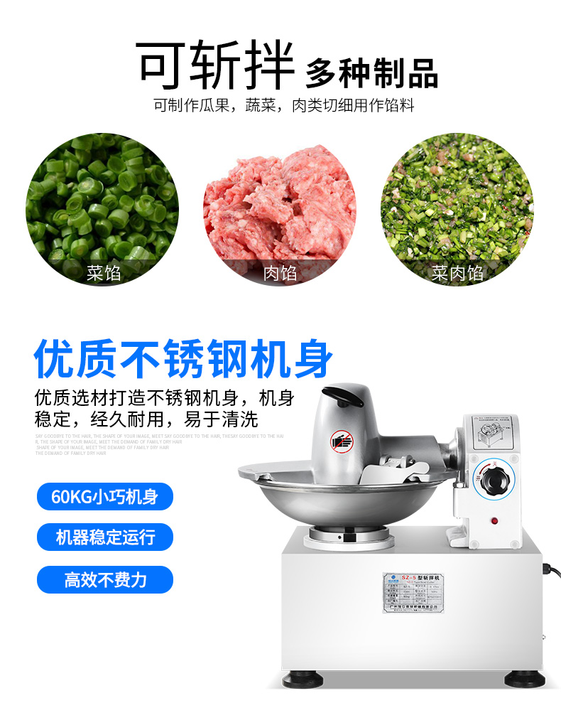 SZ-5型斬拌機,全自動斬拌機,高效安全、節(jié)能便捷、適用于制作各種餡料。可斬拌多種制品,可制作瓜果,蔬菜,肉類切細用作餡料。優(yōu)質(zhì)選材打造不銹鋼機身,機身穩(wěn)定,經(jīng)久耐用,易于清洗。