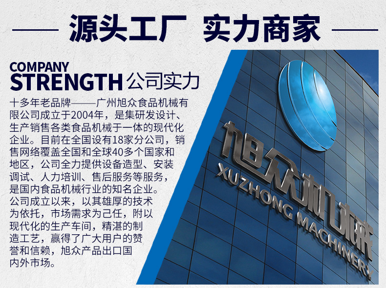 廣州旭眾食品機械有限公司是一家集科研開發(fā),生產(chǎn)設(shè)計,營銷服務(wù)為一體的現(xiàn)代化生產(chǎn)企業(yè)。現(xiàn)代化生產(chǎn)車間,精湛制造技術(shù),所產(chǎn)機械歷經(jīng)市場重重考驗,不斷贏得海內(nèi)外客戶的贊譽。