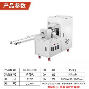 名稱XZ-MH-200麻花機(jī) 電源220/380V 功率2.2KW 產(chǎn)量40-60斤/小時 尺寸1970X500X1000mm 重量90KG 規(guī)格可調(diào) 其他