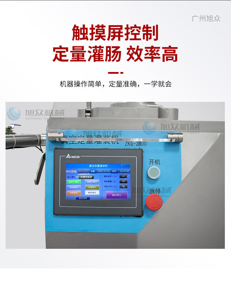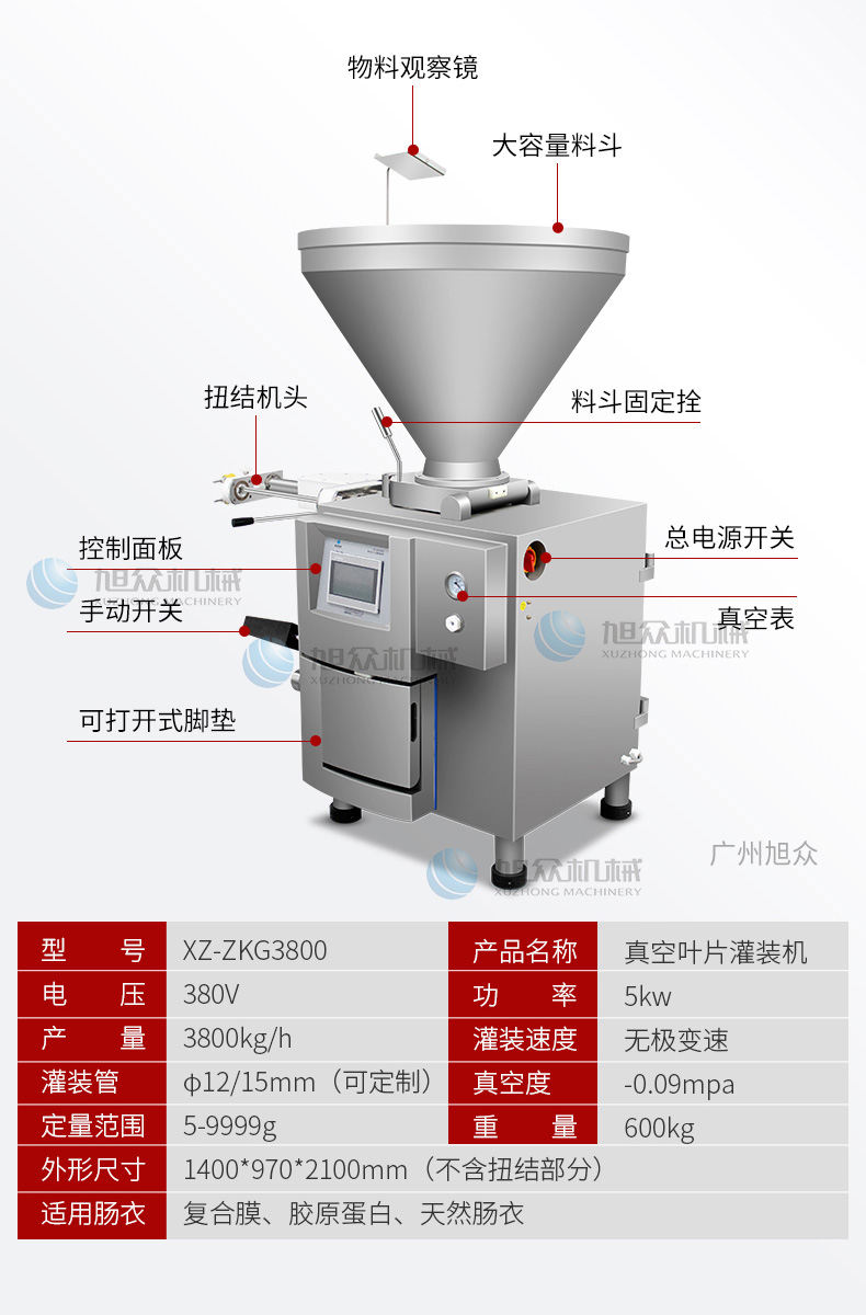 名稱XZ-ZKG2800真空灌腸機 電源380V 功率3.8k 產量280kg/h 尺寸680*610*1750mm 重量350kg 規(guī)格灌裝管&12/15mm(可定制) 其他適用腸衣復合膜、膠原蛋白、天然腸衣