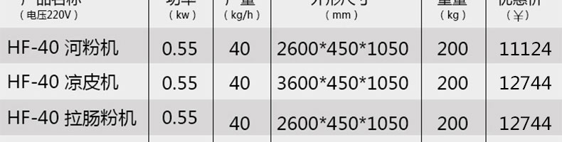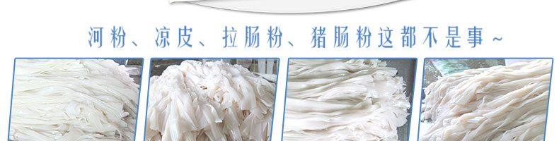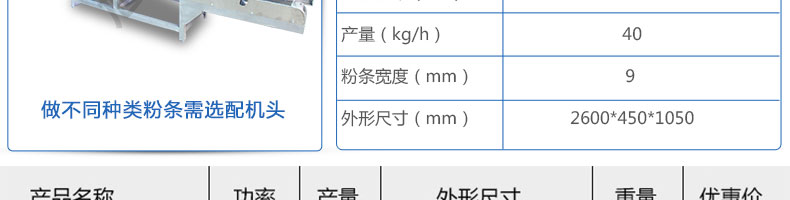 名稱SZ-HF-40涼皮機(jī) 電源220/380V 功率0.75/19kw 產(chǎn)量16/24/32/40kg/h 尺寸主機(jī)尺寸2600*450*1050mm 外形尺寸2700*650*1500mm 重量200kg 規(guī)格粉條寬度mm:4/6/8/10 其他