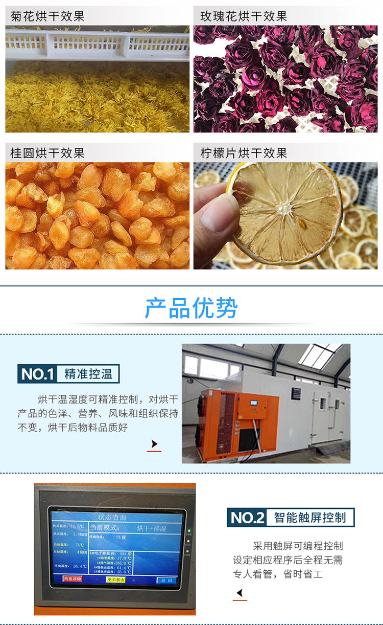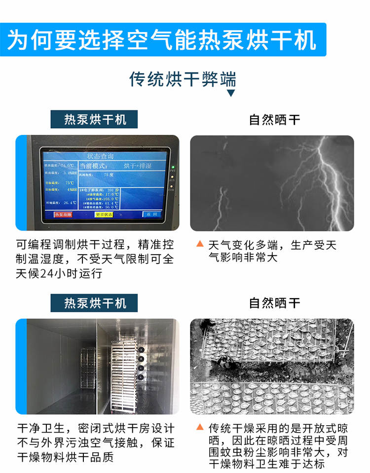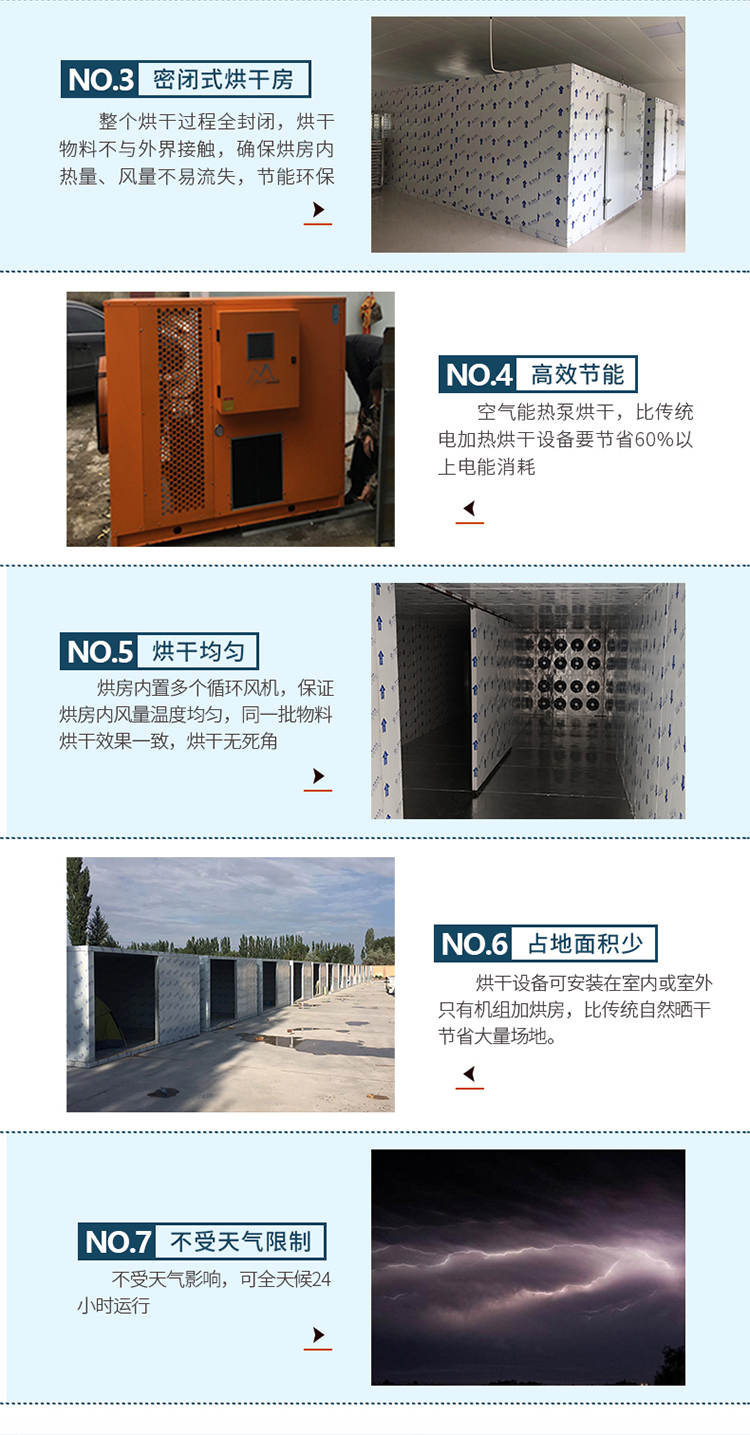 030S-T-KD06空氣能烘干機,可編程調(diào)制烘干過程,精準控制溫濕度,不受天氣限制可全天候24小時運行。干凈衛(wèi)生,密閉式烘干房設(shè)計不與外界污濁空氣接觸,保證干燥物料烘干品質(zhì)。高效節(jié)能,不用專人看守,可實現(xiàn)一人同時管理多間烘房減少人工費用