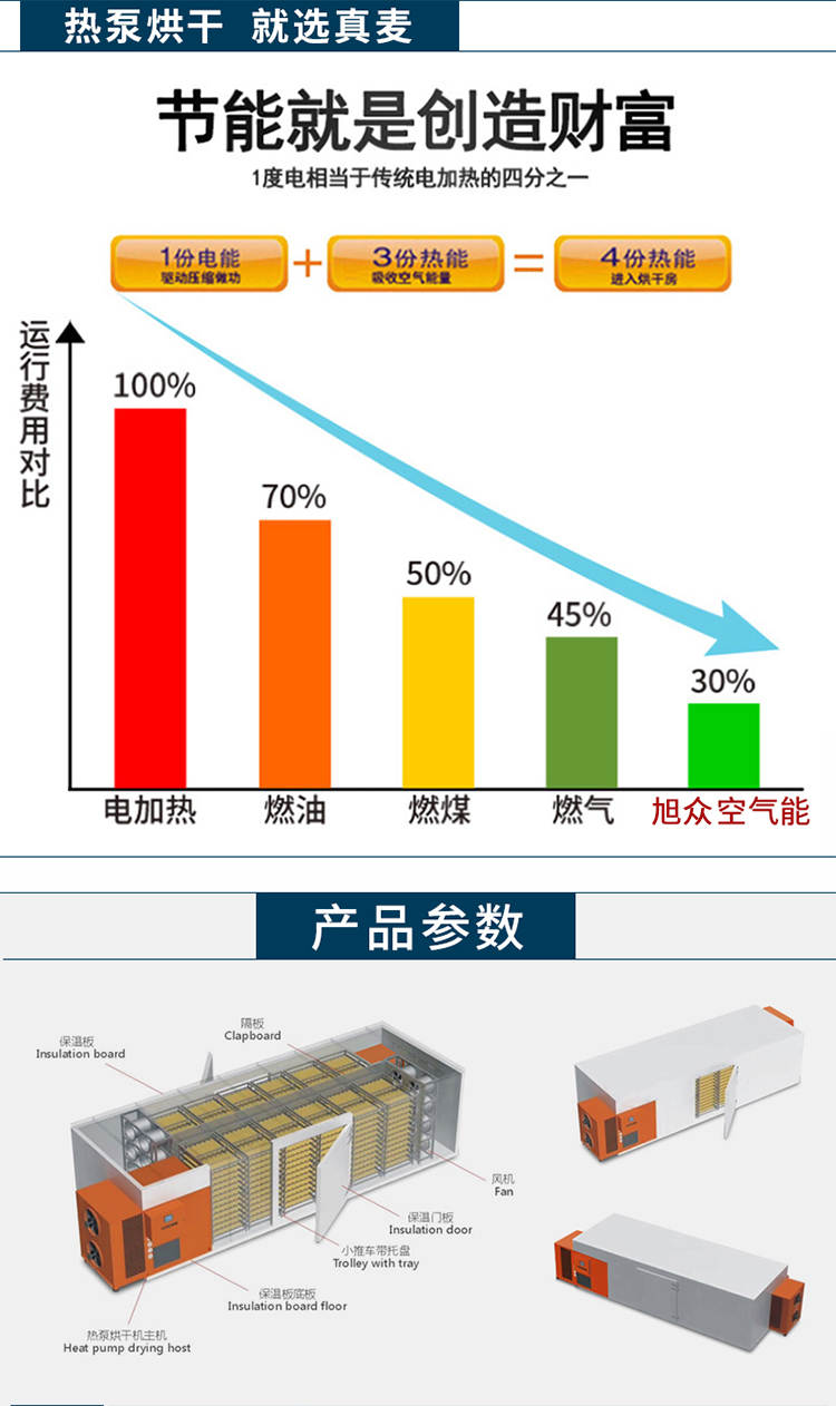 名稱030S-T-KD06空氣能烘干機 電源380v 功率6kw 產(chǎn)量9kw 尺寸1675X860x1280 重量180kg 規(guī)格2800X2200X2200mm 其他