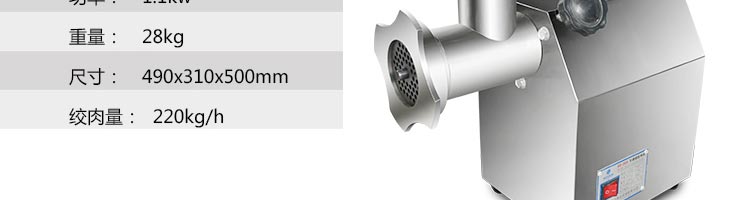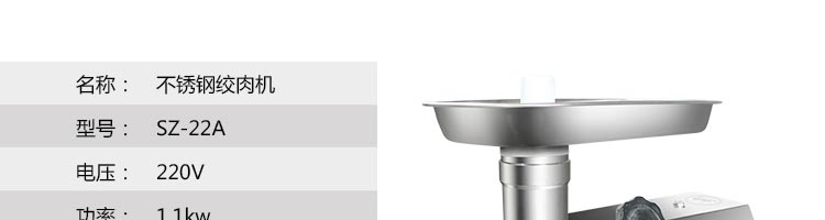 名稱SZ-22A 絞肉機(jī) 電源380v 功率1.1kw 產(chǎn)量220千克/小時(shí) 尺寸430*210*460mm 重量63kg 規(guī)格 其他