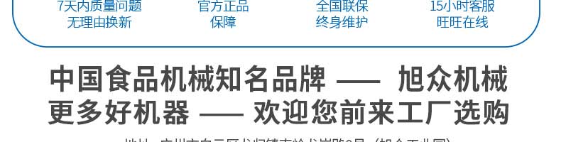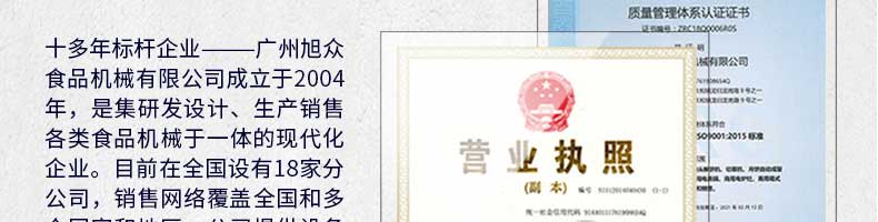 廣州旭眾食品機械有限公司是一家集科研開發(fā),生產(chǎn)設計,營銷服務為一體的現(xiàn)代化生產(chǎn)企業(yè)?,F(xiàn)代化生產(chǎn)車間,精湛制造技術(shù),所產(chǎn)機械歷經(jīng)市場重重考驗,不斷贏得海內(nèi)外客戶的贊譽。