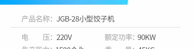 名稱28小型餃子機 電源220V 功率90KW 產(chǎn)量1500個/h 尺寸350*370*480mm 重量45KG 規(guī)格 其他