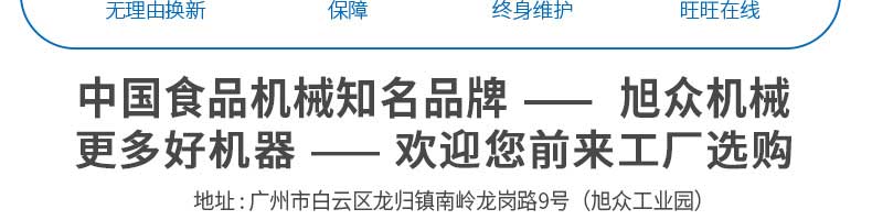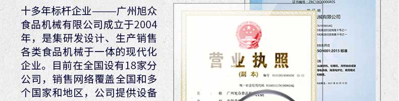 廣州旭眾食品機械有限公司是一家集科研開發(fā),生產(chǎn)設計,營銷服務為一體的現(xiàn)代化生產(chǎn)企業(yè)?,F(xiàn)代化生產(chǎn)車間,精湛制造技術(shù),所產(chǎn)機械歷經(jīng)市場重重考驗,不斷贏得海內(nèi)外客戶的贊譽。