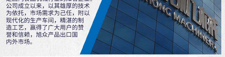 廣州旭眾食品機(jī)械有限公司是一家集科研開發(fā),生產(chǎn)設(shè)計(jì),營銷服務(wù)為一體的現(xiàn)代化生產(chǎn)企業(yè)?,F(xiàn)代化生產(chǎn)車間,精湛制造技術(shù),所產(chǎn)機(jī)械歷經(jīng)市場重重考驗(yàn),不斷贏得海內(nèi)外客戶的贊譽(yù)。