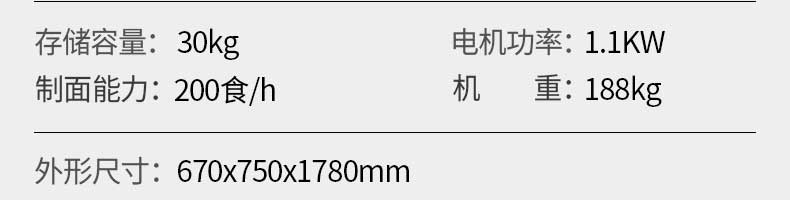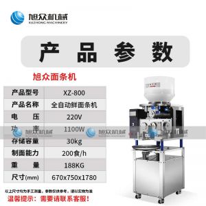 名稱XZ-800全自動鮮面條機 電源220V 功率電機功率:11KW 產(chǎn)量制面能力:200食/h 尺寸670X750X1780mm 重量188kg 規(guī)格聯(lián)系銷售員 其他存儲容量:30kg