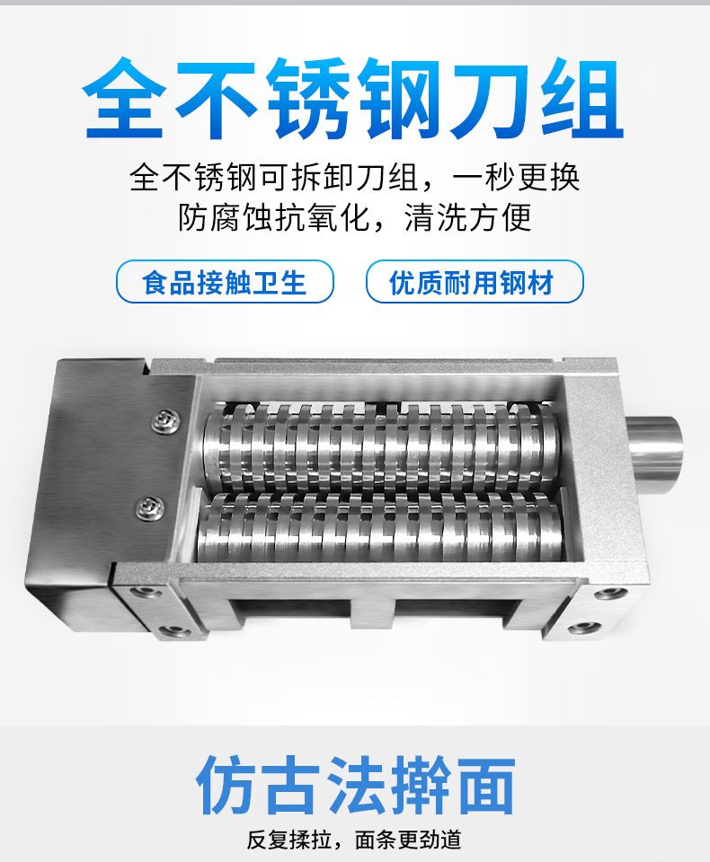 XZ-M800面條機(jī),制作多種面條:拉面、小面、牛肉面、韭葉面板面、褲帯面、蔬菜面、水果面、雜糧面8秒快速出面人性化設(shè)計(jì),更便捷更高效與同類型機(jī)器相比,出面更快、秒換刀具。全不銹鋼刀組全不銹鋼可拆卸刀組,一秒更換防腐蝕抗氧化,清洗方便。