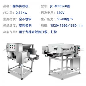 名稱智能米飯扒松機-翻轉扒松機 電源380V 功率0.37Kw 產量60~80鍋/h 尺寸1520x1260x1380mm 重量請咨詢銷售員 規(guī)格請咨詢銷售員 其他