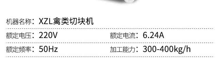 名稱XZL禽類切塊機 電源220V 功率1100W 產(chǎn)量300-400kg/H 尺寸 重量80kg 規(guī)格 其他