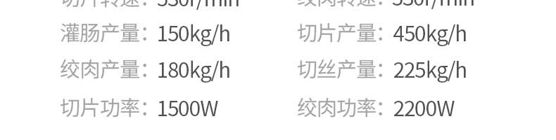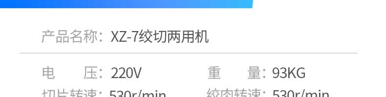 名稱XZ-7絞切機(jī) 電源220V 功率切片功率:1500W、絞肉功率:2200W 產(chǎn)量灌腸:150kg/h、切片:450kg/h、絞肉:180kg/h、切絲:225kg/h 尺寸600×440X820mm 重量93KG 規(guī)格聯(lián)系銷售員 其他切片轉(zhuǎn)速:530/mn、絞肉轉(zhuǎn)速:530r/min