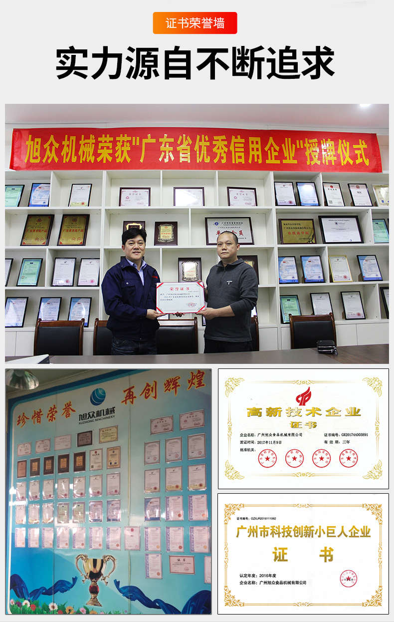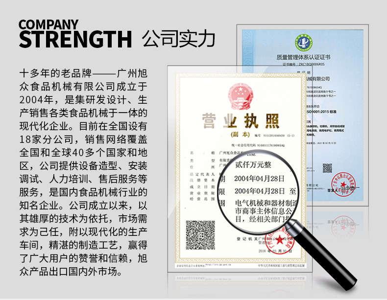 廣州旭眾食品機械有限公司是一家集科研開發(fā),生產(chǎn)設(shè)計,營銷服務(wù)為一體的現(xiàn)代化生產(chǎn)企業(yè)?,F(xiàn)代化生產(chǎn)車間,精湛制造技術(shù),所產(chǎn)機械歷經(jīng)市場重重考驗,不斷贏得海內(nèi)外客戶的贊譽。