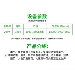 名稱全自動(dòng)大型葉菜清洗線 電源20kw 功率380V 產(chǎn)量1000-1500kg/h 尺寸18000mm*1460mm*1550mm 重量請(qǐng)資詢銷售員 規(guī)格請(qǐng)資詢銷售員 其他