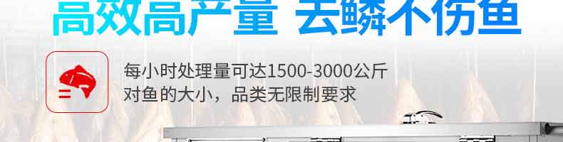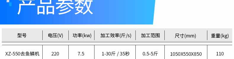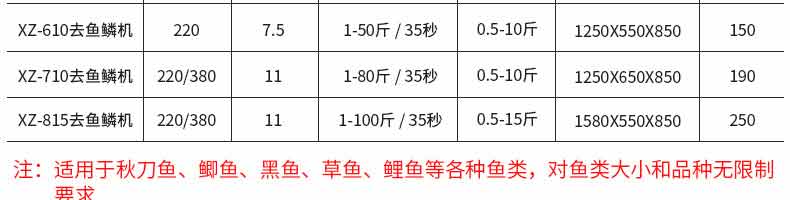 名稱XZ-710去魚鱗機(jī) 電源220V/380V 功率3.0kw/2.2kw 產(chǎn)量1-80斤/35秒 尺寸1250×650×850mm 重量190kg 規(guī)格 其他加工范圍:0.5-10斤