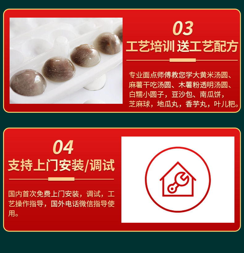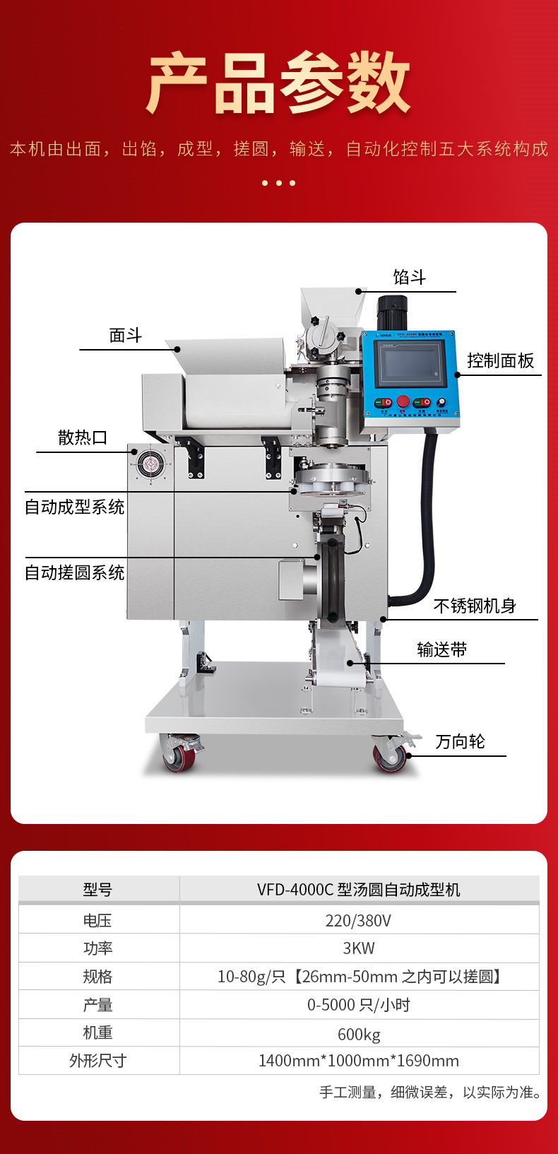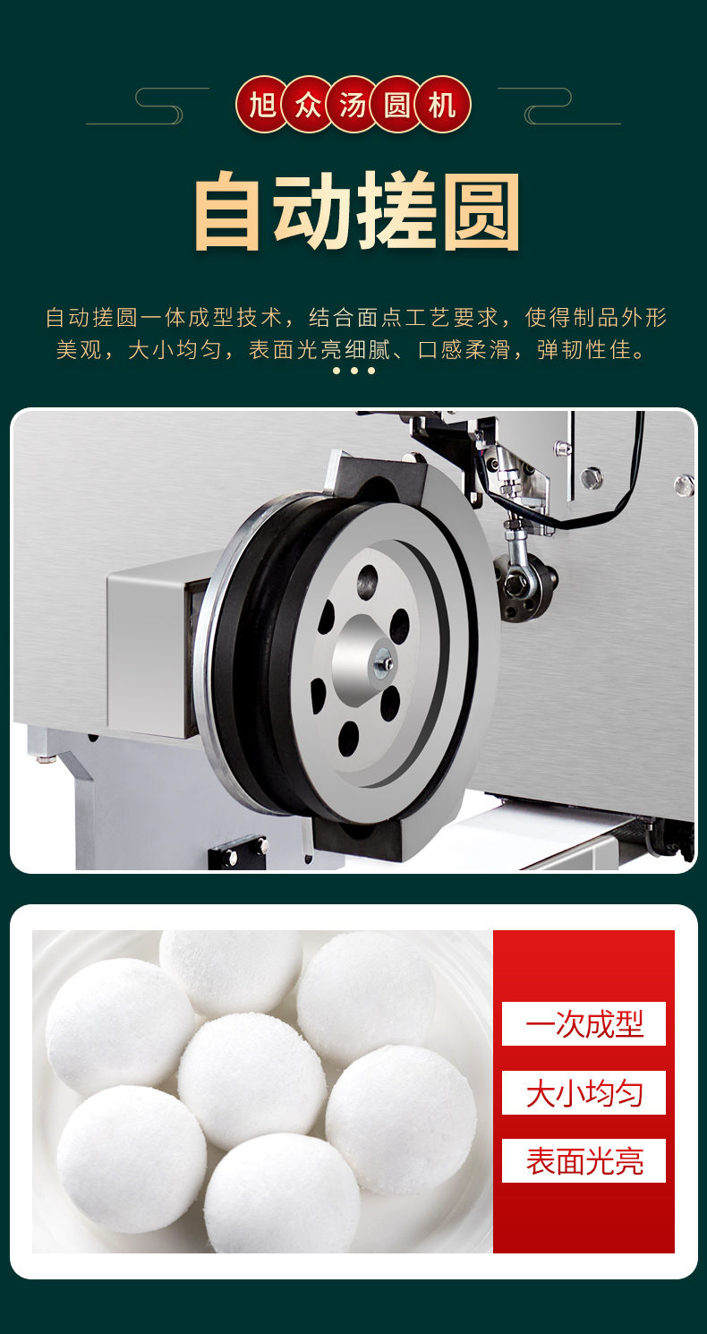 名稱4000C湯圓機(jī) 電源220/380V 功率3KW 產(chǎn)量0-5000只/小時(shí) 尺寸1400mm*1000mm*1690mm 重量600kg 規(guī)格10-80g/只【26mm-50mm之內(nèi)可以搓圓】 其他