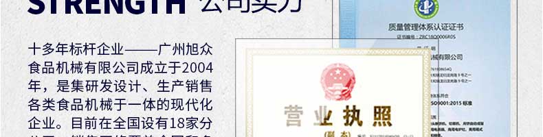 廣州旭眾食品機(jī)械有限公司是一家集科研開發(fā),生產(chǎn)設(shè)計(jì),營(yíng)銷服務(wù)為一體的現(xiàn)代化生產(chǎn)企業(yè)?,F(xiàn)代化生產(chǎn)車間,精湛制造技術(shù),所產(chǎn)機(jī)械歷經(jīng)市場(chǎng)重重考驗(yàn),不斷贏得海內(nèi)外客戶的贊譽(yù)。