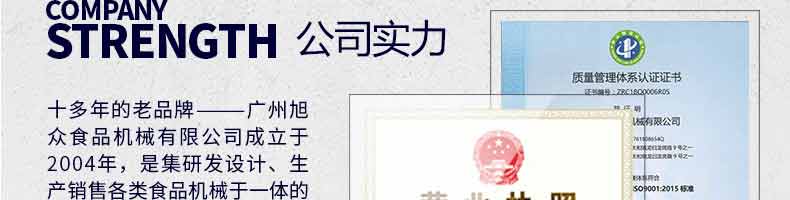 廣州旭眾食品機(jī)械有限公司是一家集科研開發(fā),生產(chǎn)設(shè)計(jì),營銷服務(wù)為一體的現(xiàn)代化生產(chǎn)企業(yè)?,F(xiàn)代化生產(chǎn)車間,精湛制造技術(shù),所產(chǎn)機(jī)械歷經(jīng)市場重重考驗(yàn),不斷贏得海內(nèi)外客戶的贊譽(yù)。