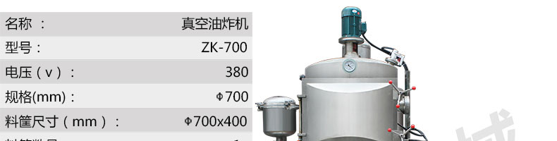 名稱zk-700雙室低溫真空油炸機 電源380V 功率11+3kw 產(chǎn)量15-60kg/次 尺寸1600*1600*2700mm 重量 規(guī)格料框數(shù)量1組;加熱方式:導(dǎo)熱油 其他